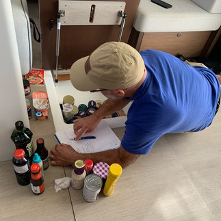 From left to right: Christine preparing 8 dinners for the freezer, Megan unclogging the bilge pump under her bunk, Dan conducting an inventory of provisioned food.