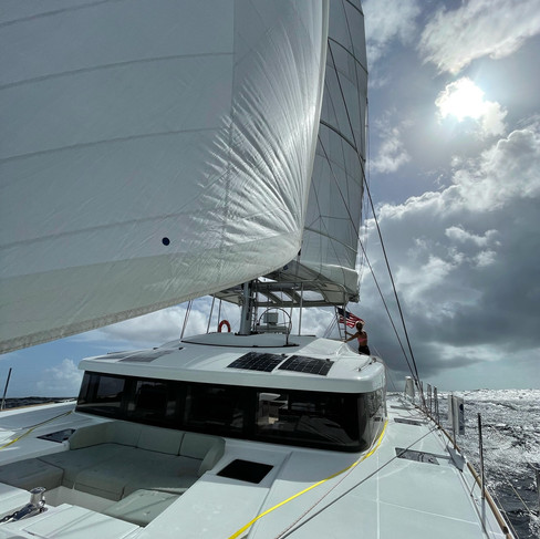 Our trade wind sail is absolutely huge and looks like a huge wall of sail in front of the boat and requires some one watching for obstacles or other boats from the galley area or up at the bow of the boat.